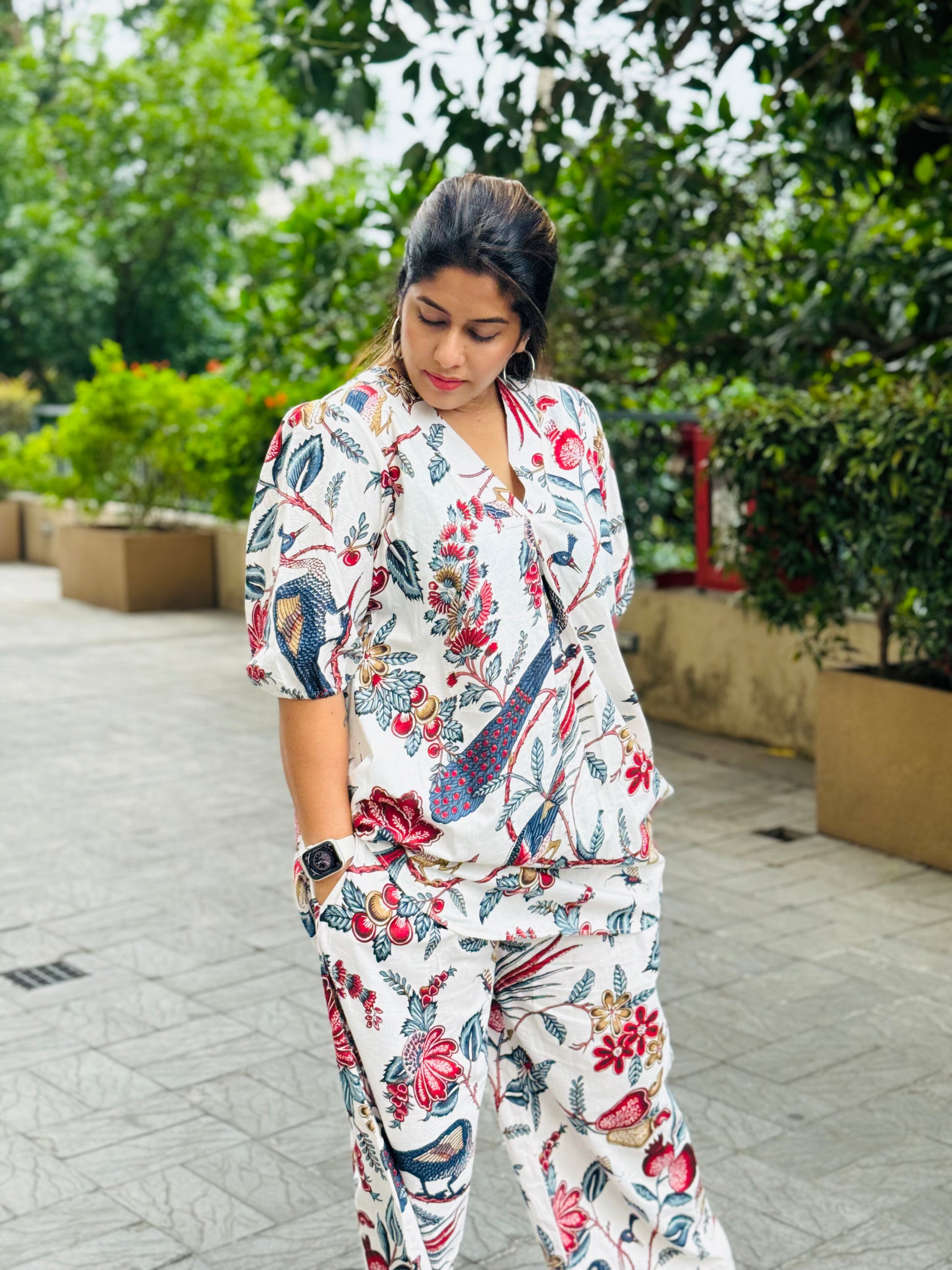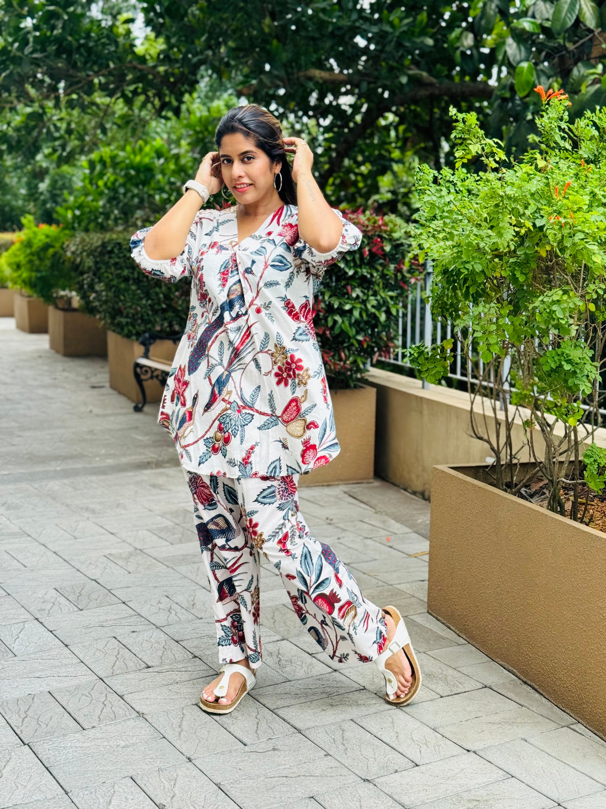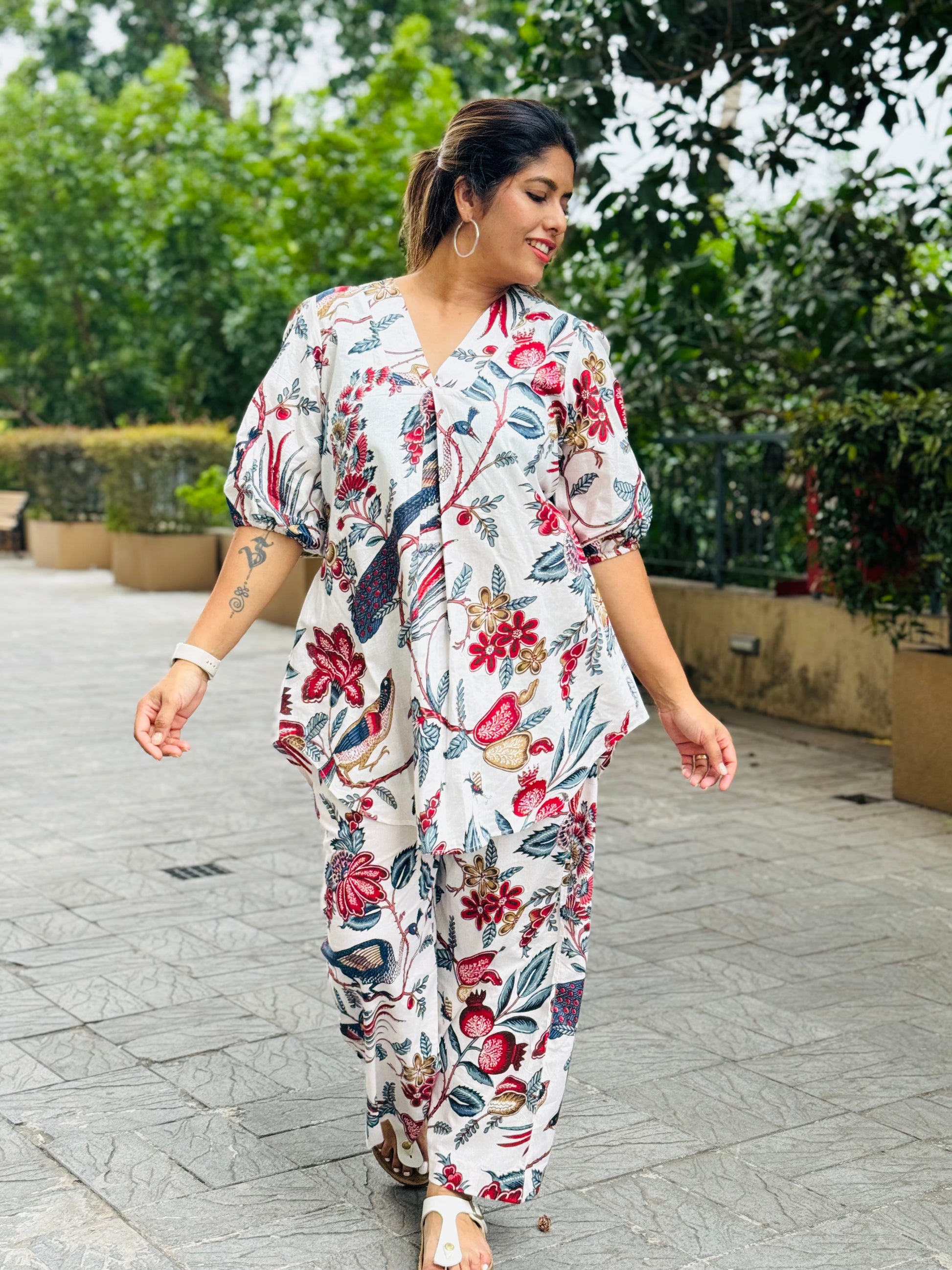 Our relaxed cotton printed co-ord set comes with a mid thigh length tunic with comfortable pants .