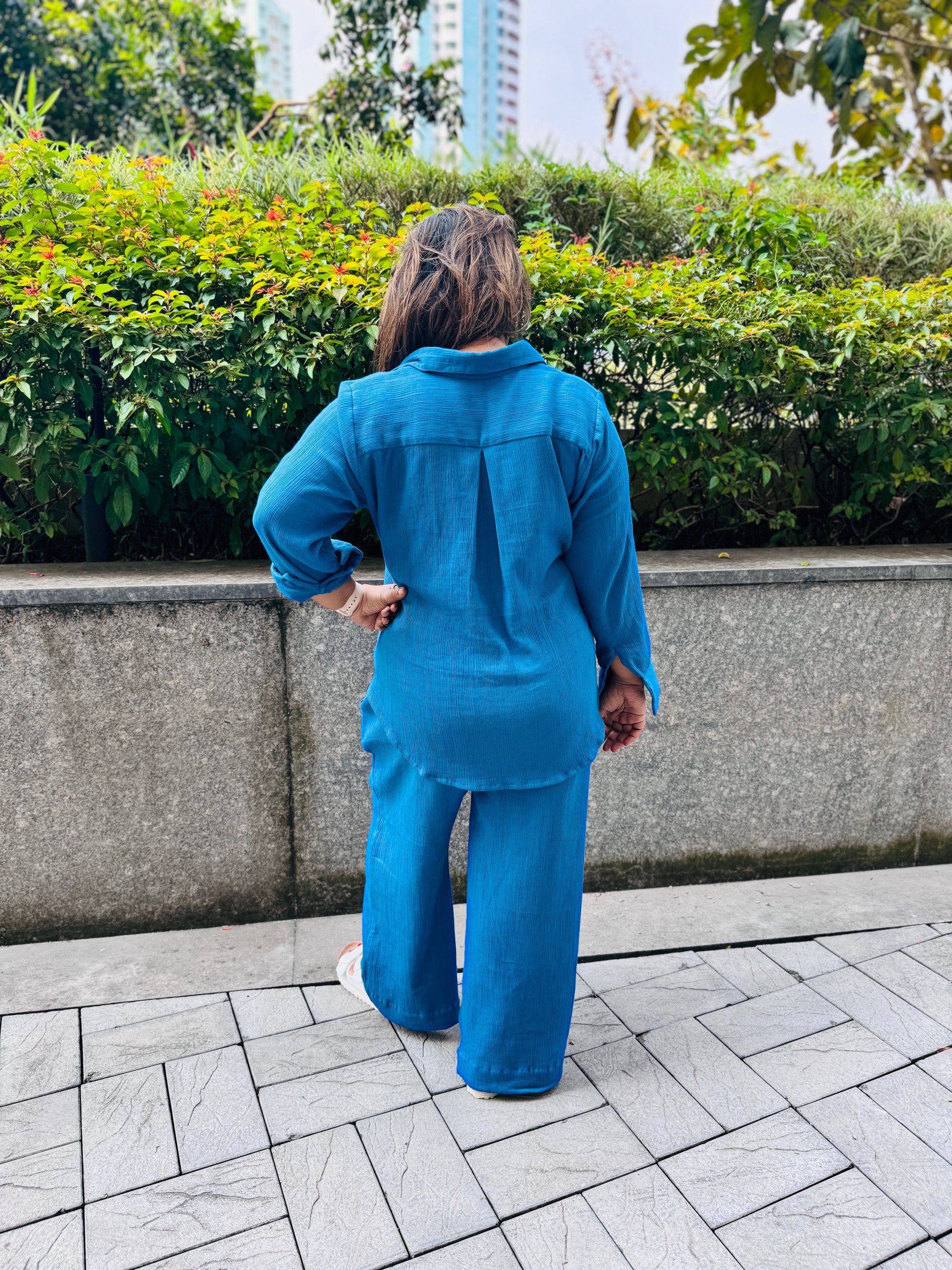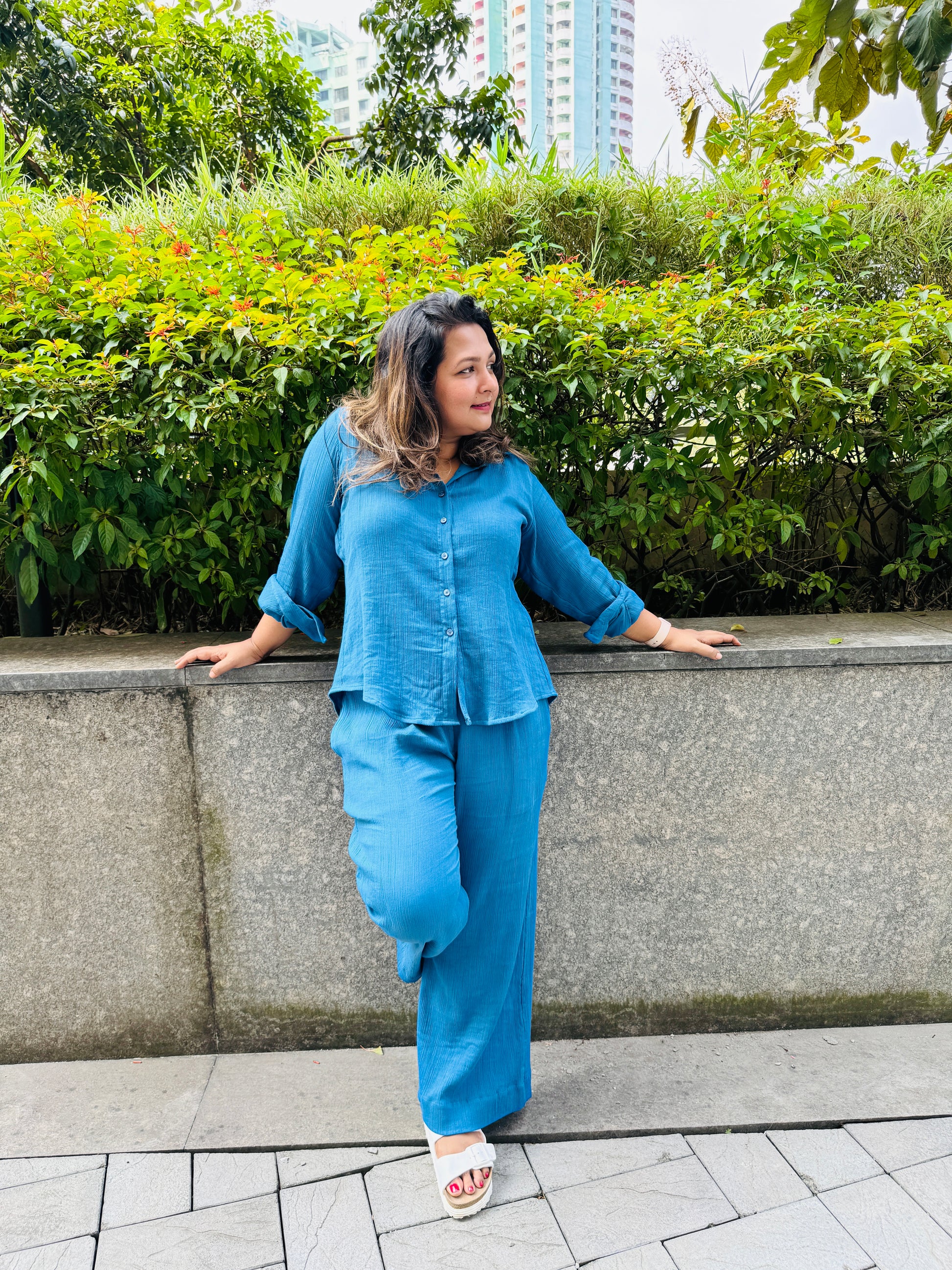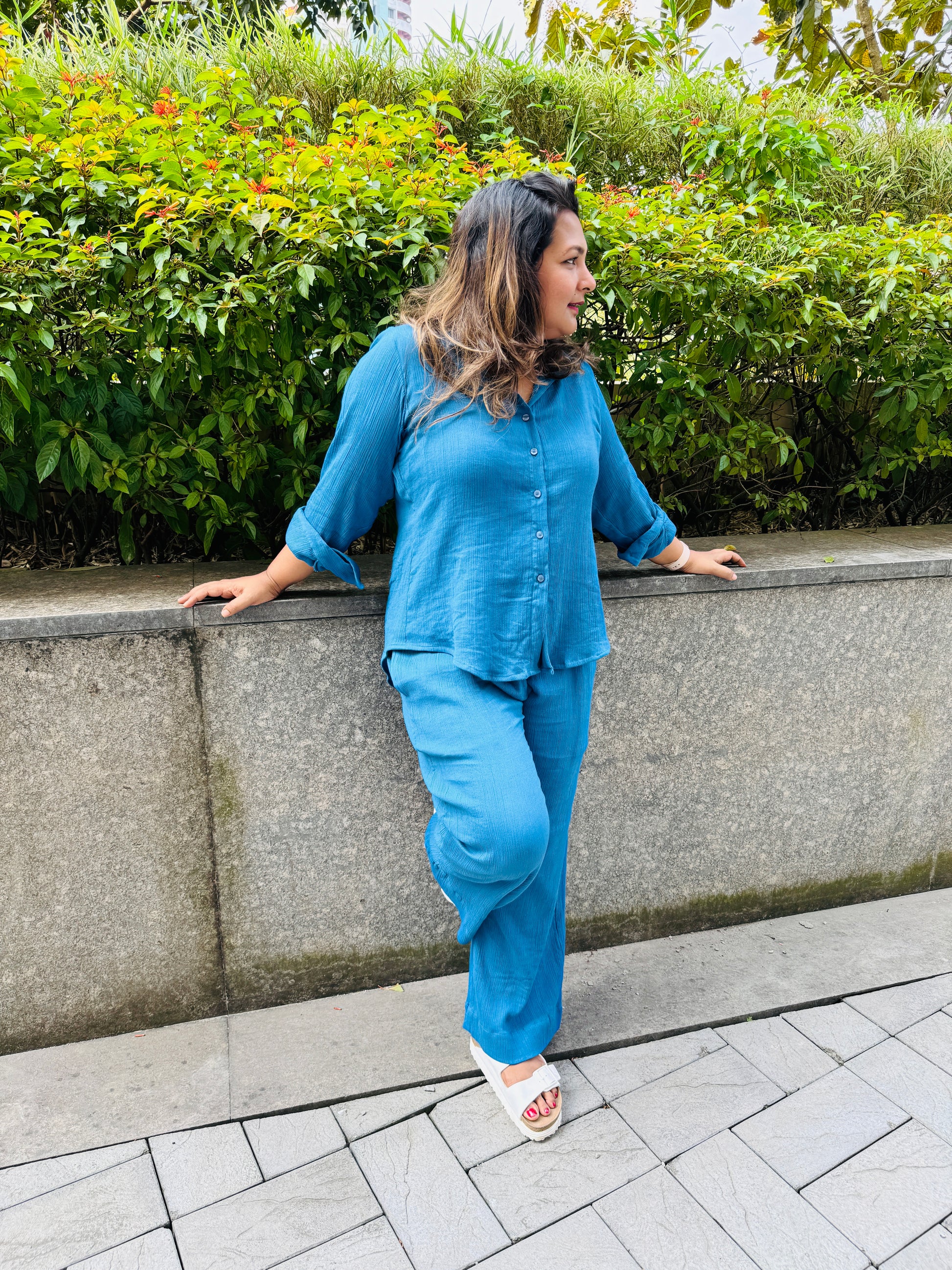Classy comfortable organic crush cotton co ord set comes with front pleated comfortable pants and cool shirt.