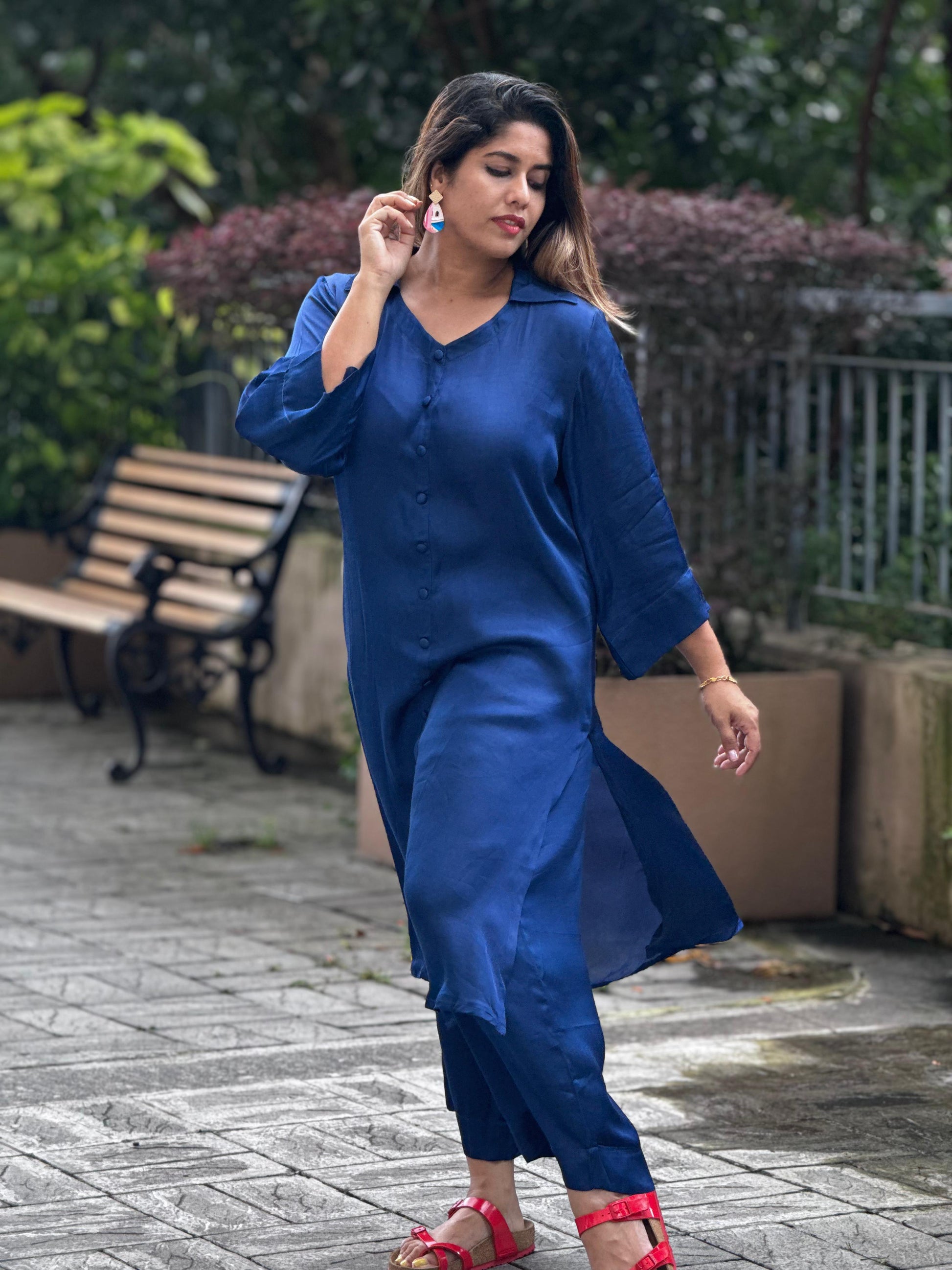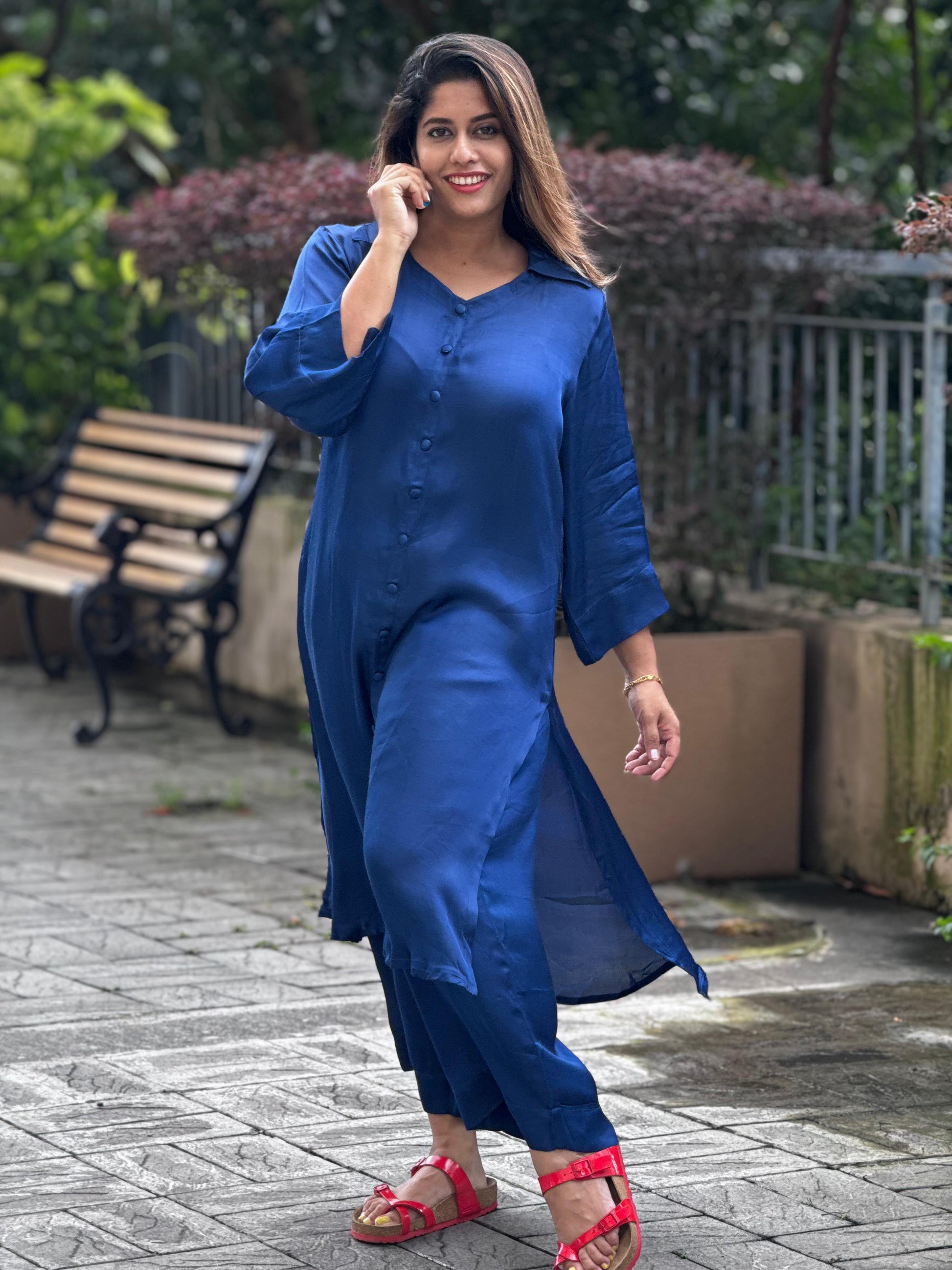 This vibrant ensemble is crafted from luxurious modal satin fabric, ensuring a soft, lustrous finish and effortless drape.