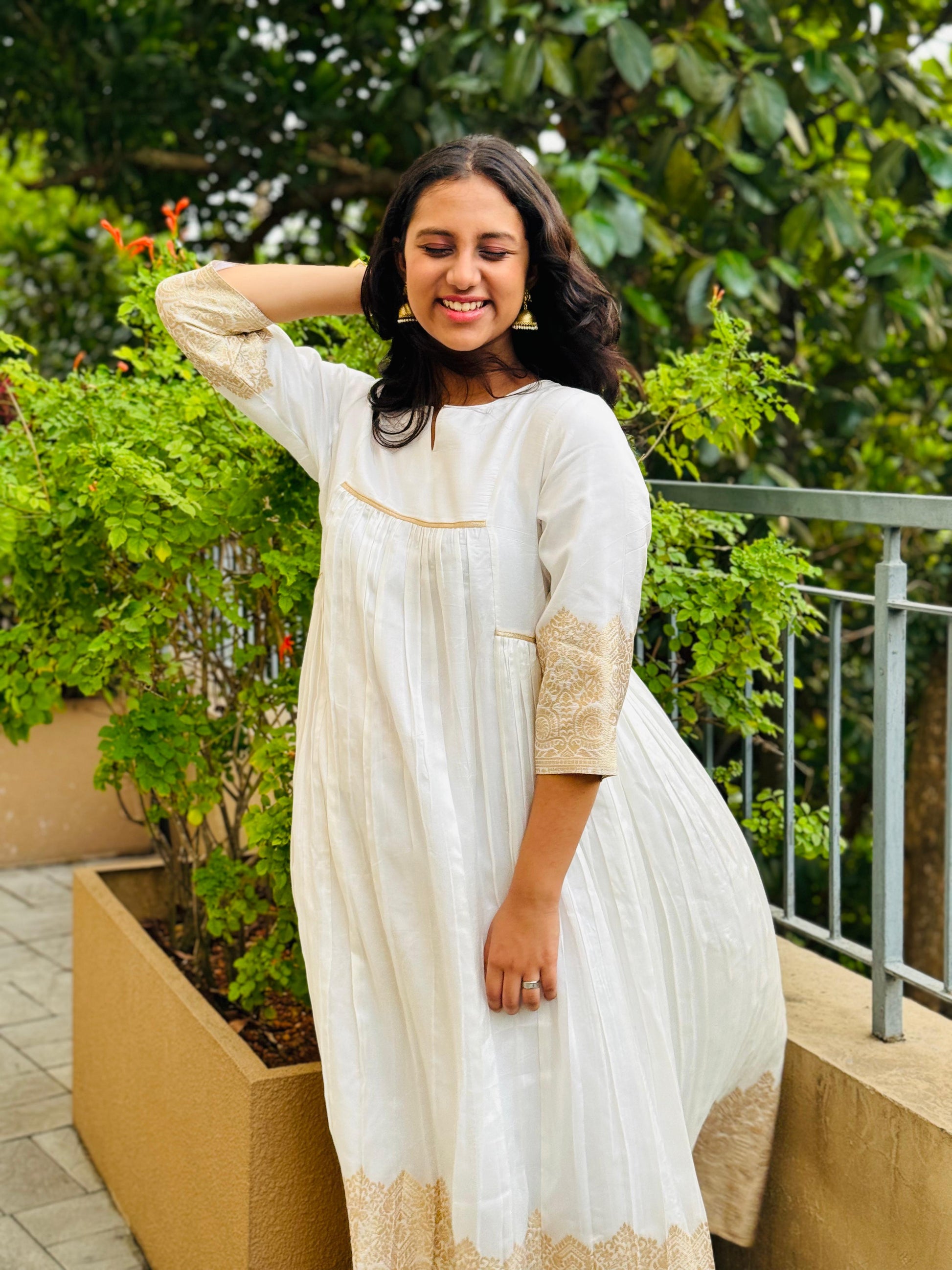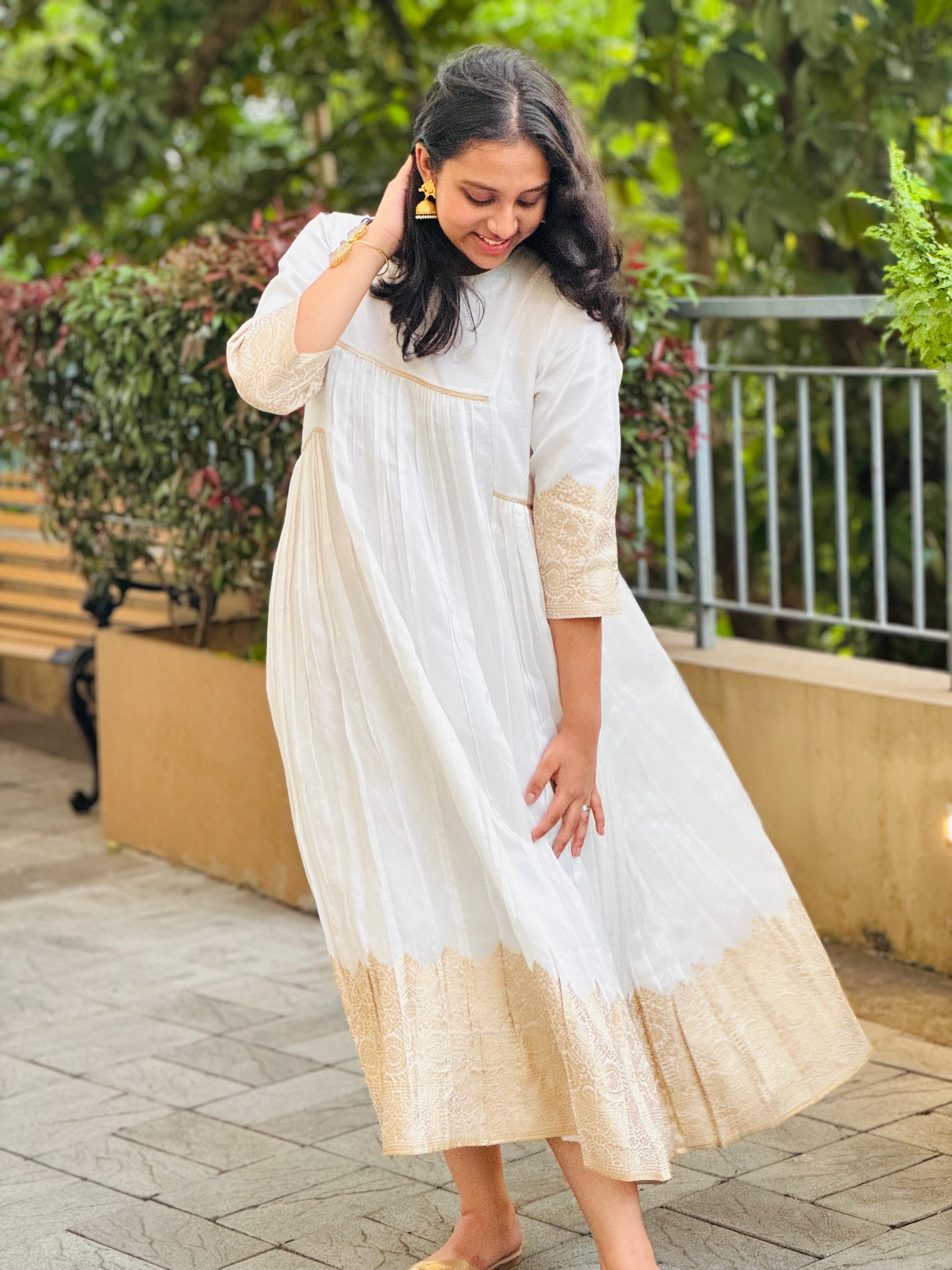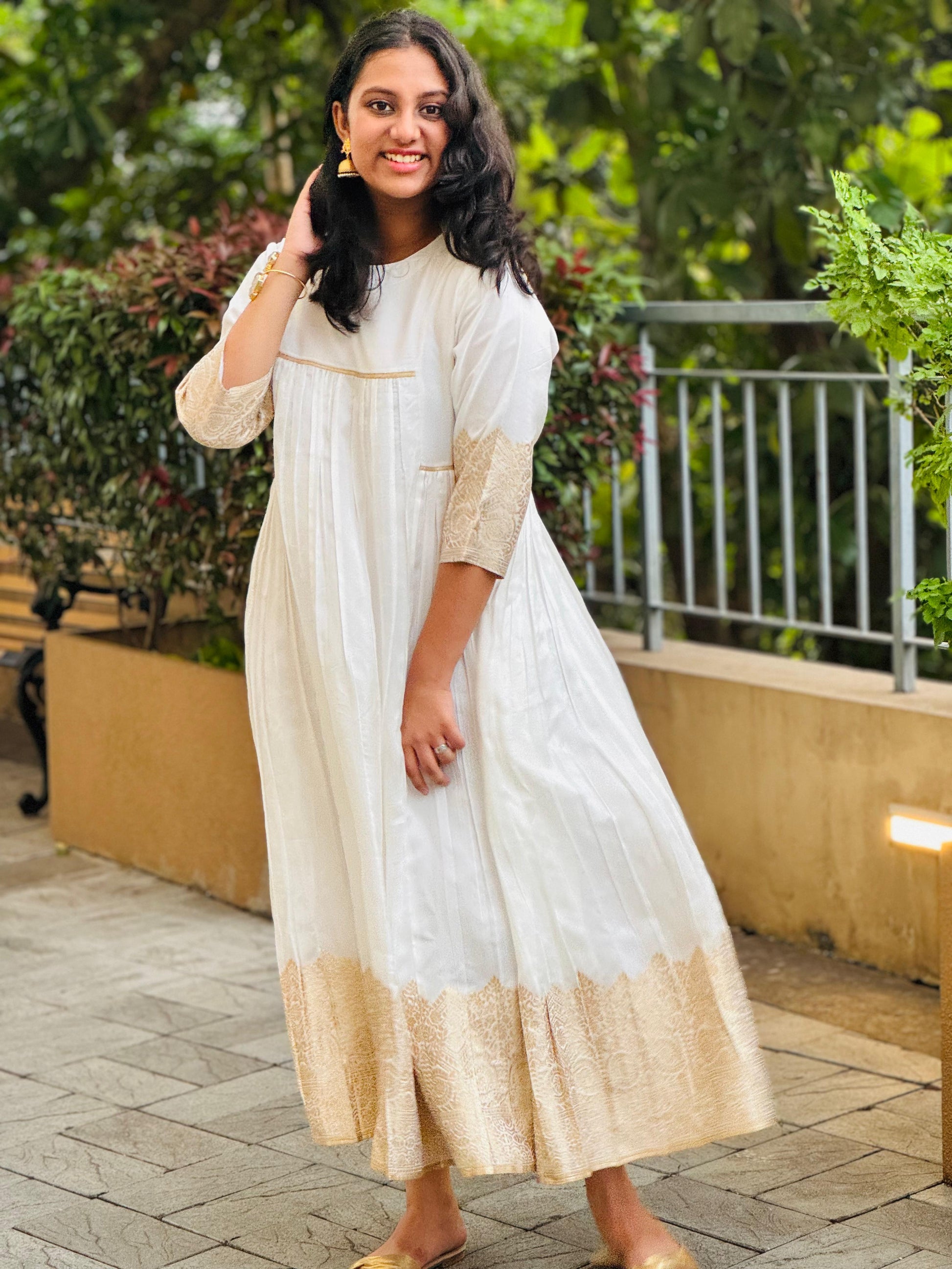 Exude elegance and tradition this Onam in our exquisite Silk dress, The luxurious Silk fabric drapes gracefully, while the zari Jaquard border on sleeve and end of the dress adds a touch of sophistication and cultural heritage.