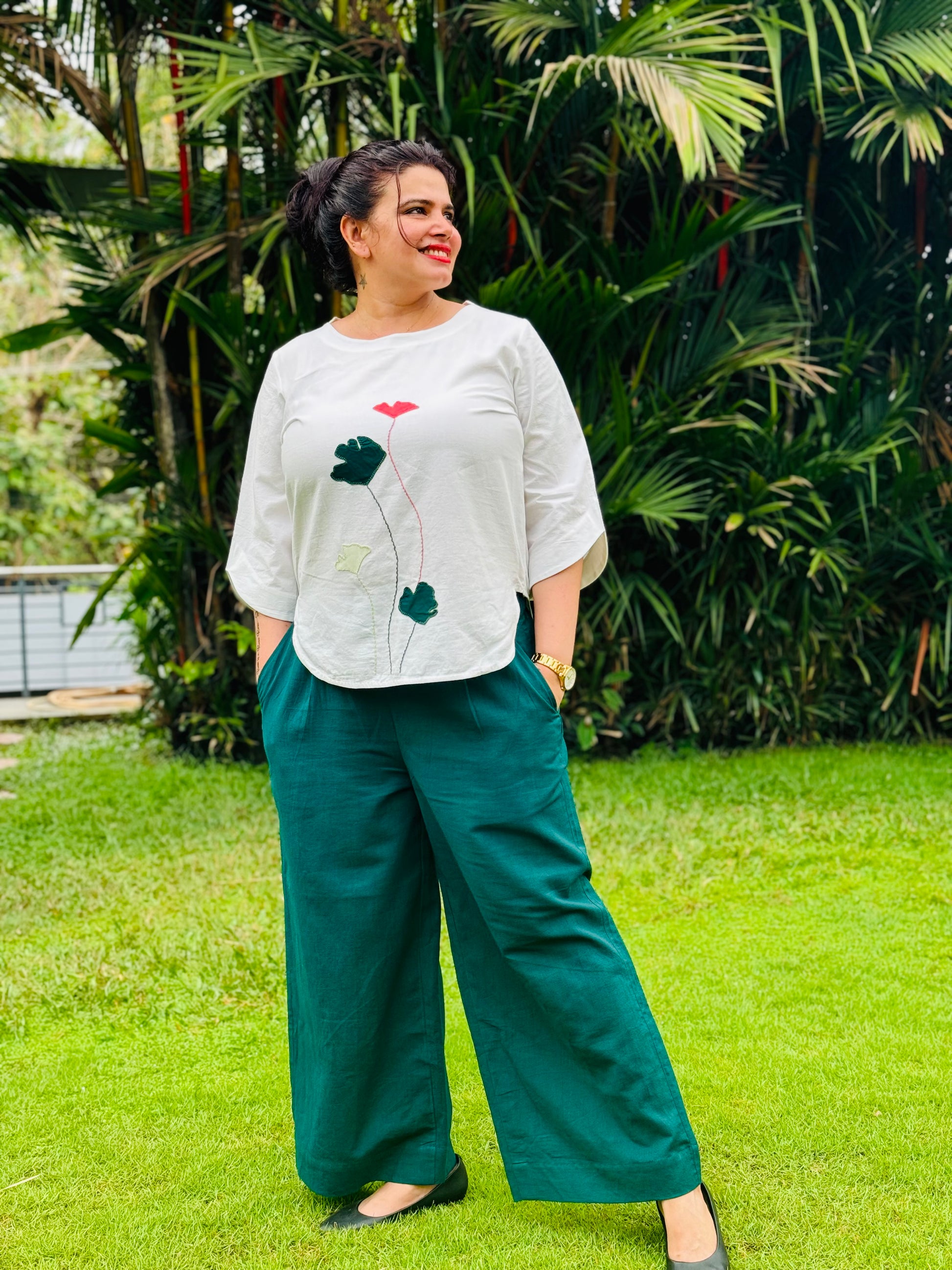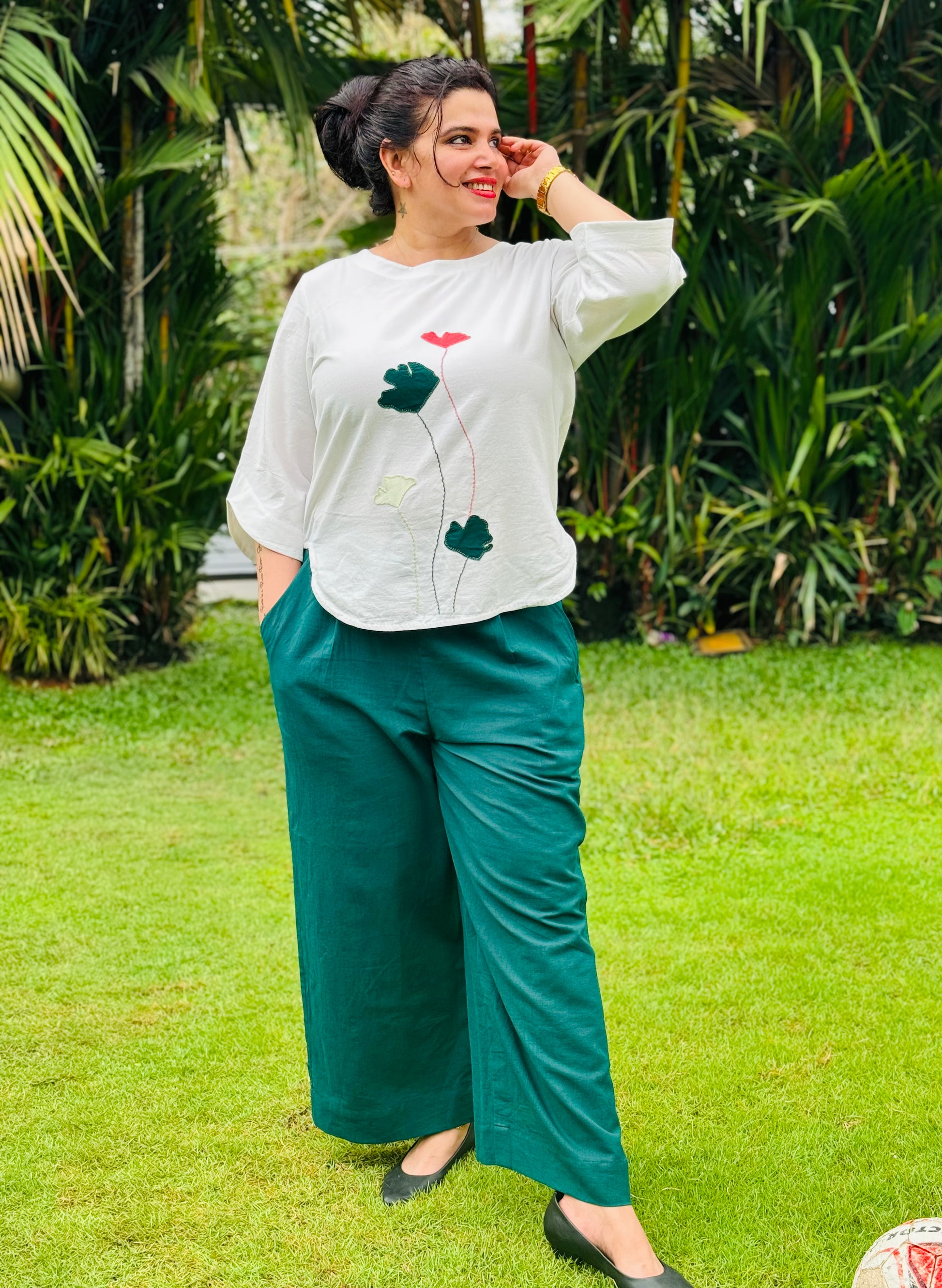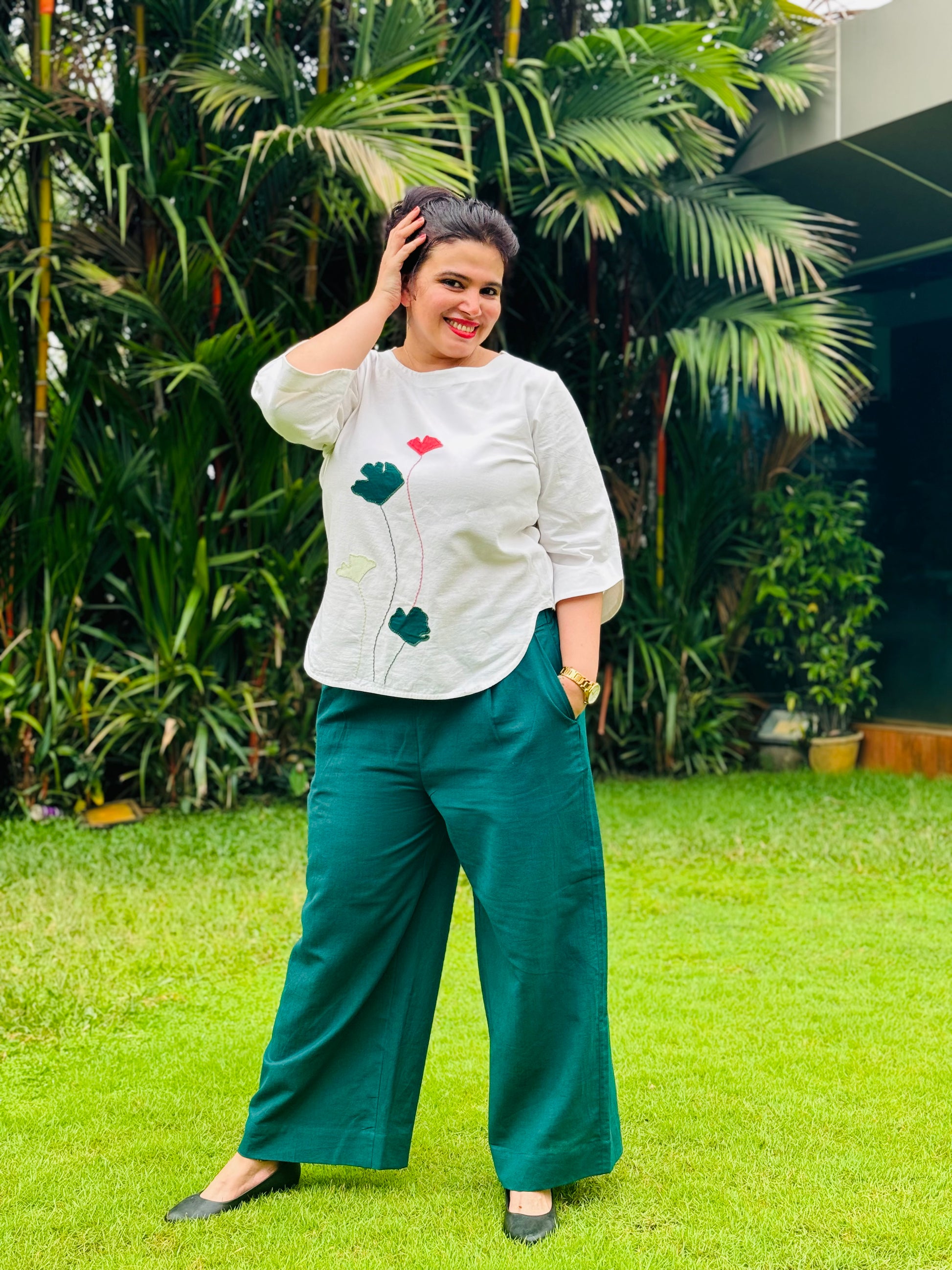 This deep forest green linen flair pant come with a off white linen top with beautiful appliqué embro on front body .this Super comfortable and stylish linen co ord set a must have this season .