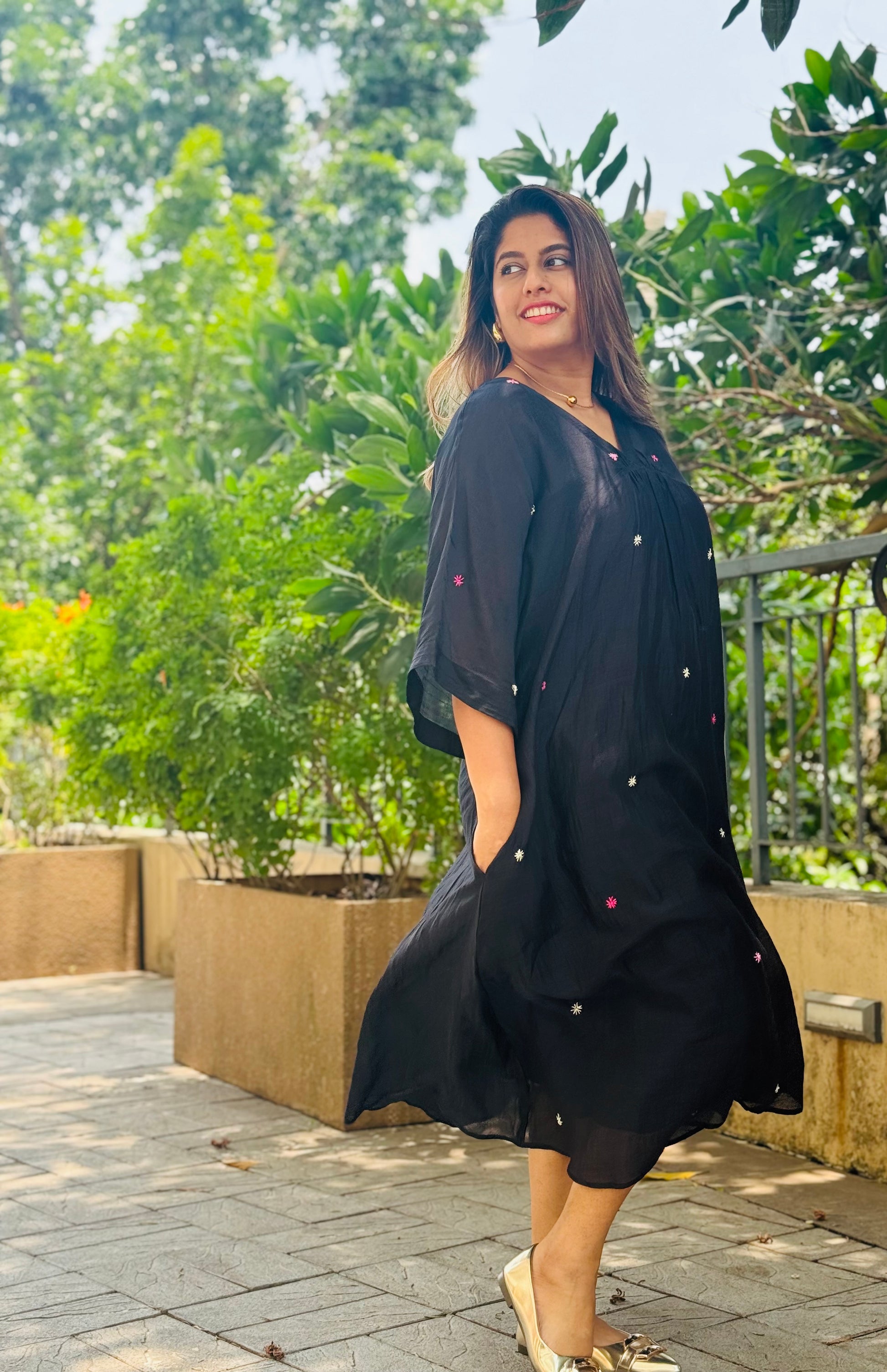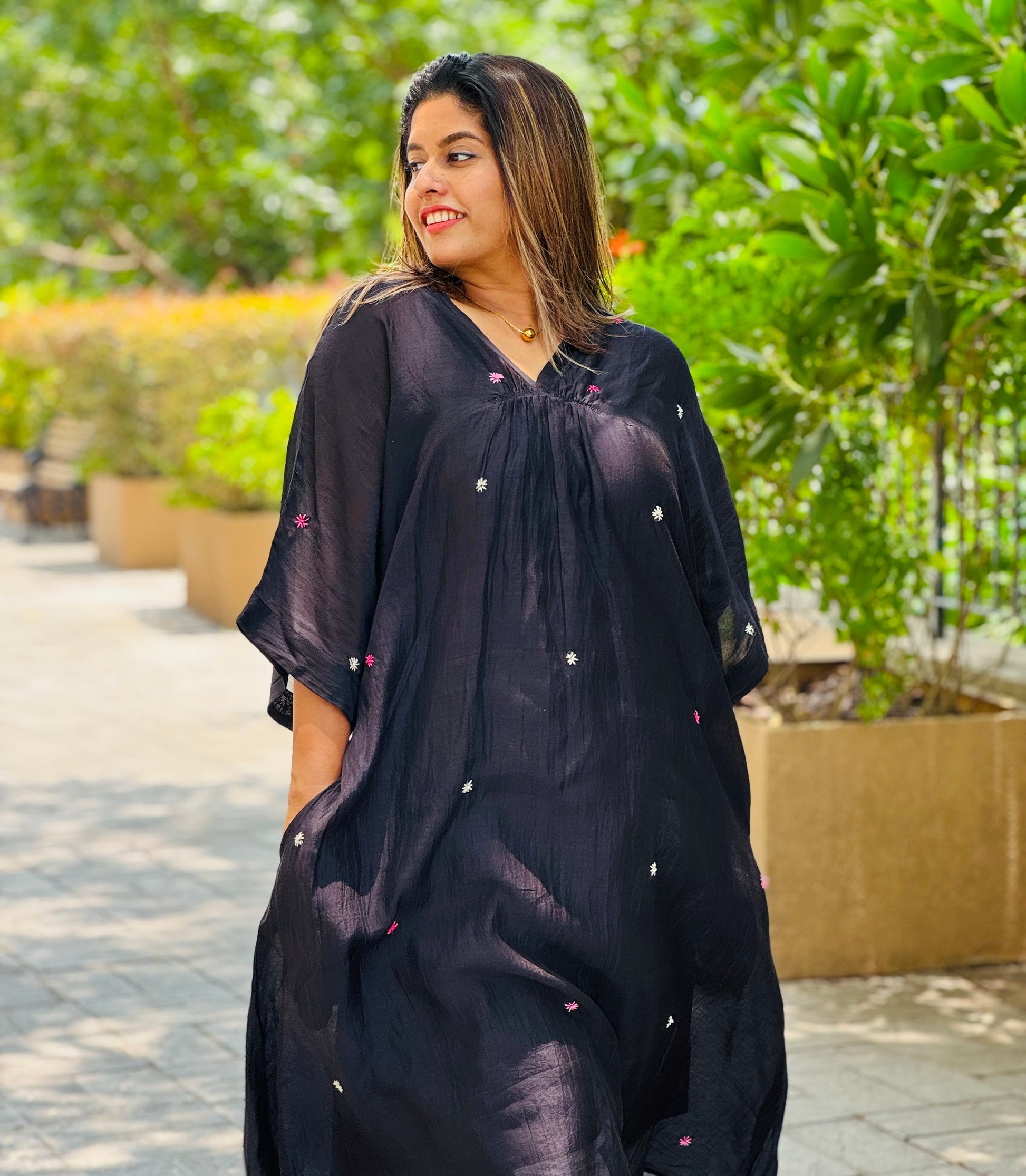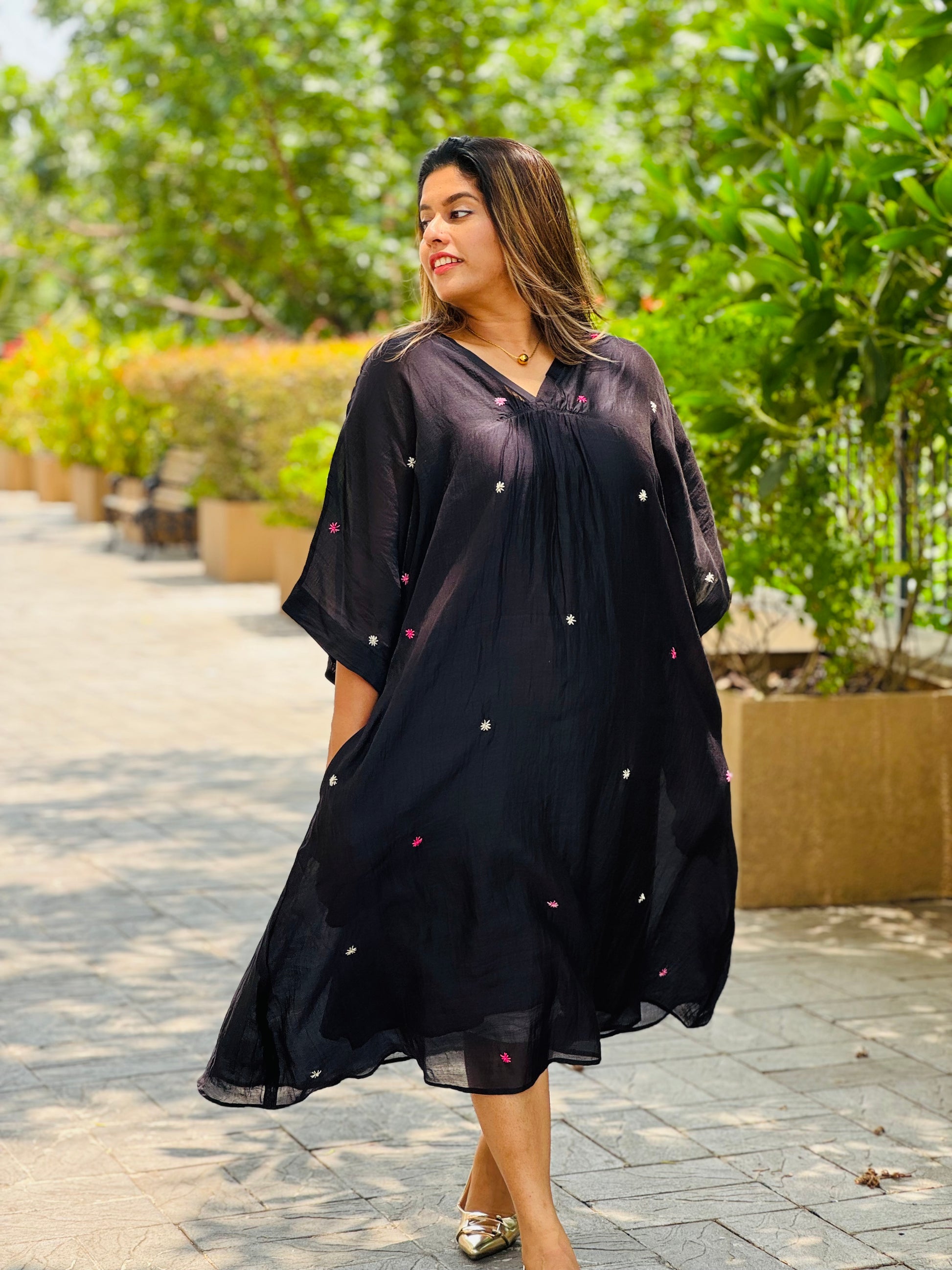 Add some fun to your wardrobe with this kaftan dress with delicate flower hand embroidered all over front body .The relaxed anti-fit makes it a comfortable anytime wear essential.