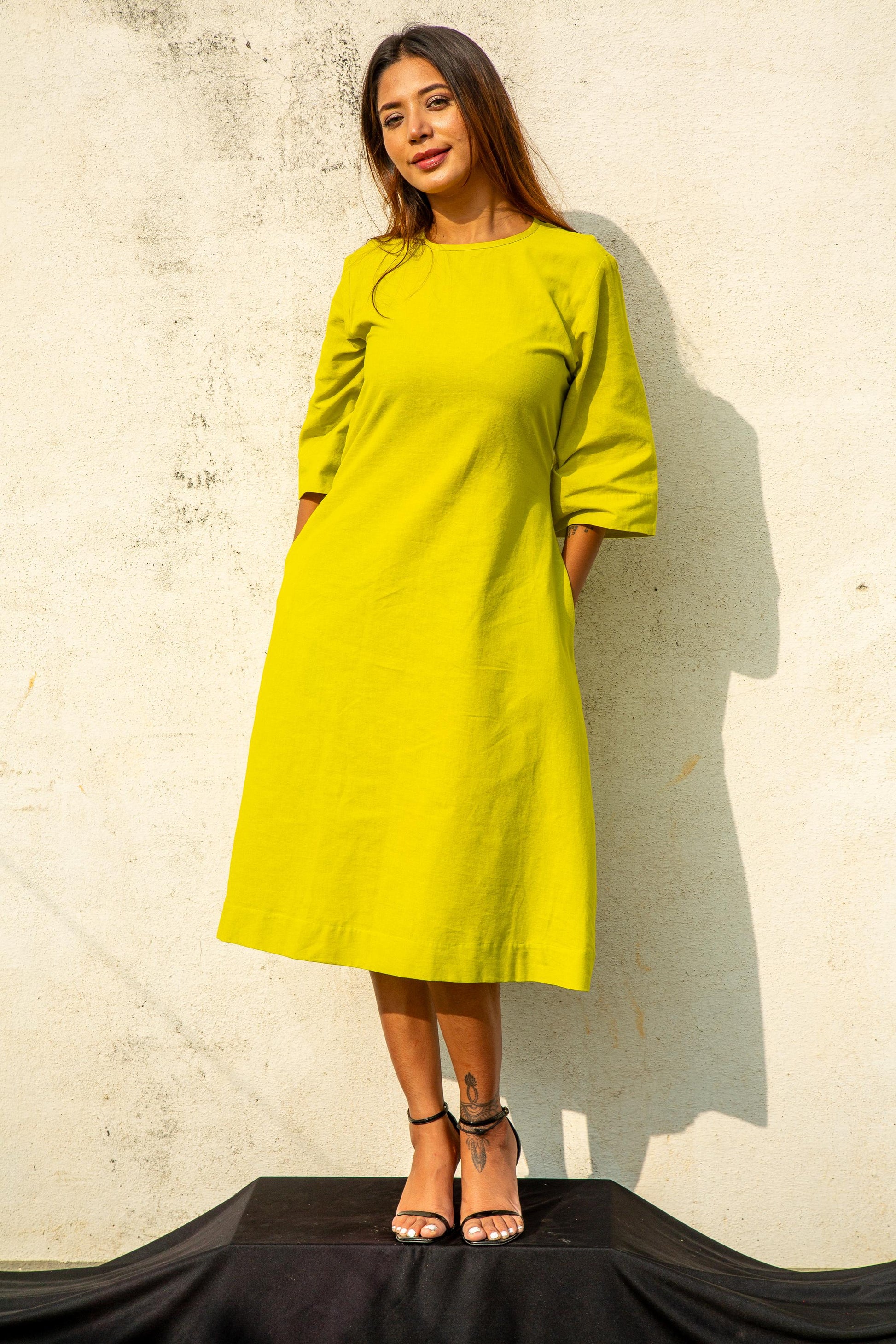 Bright and breezy, this lemon yellow linen shift dress is designed for ultimate comfort. With wooden button detailing at the back, it adds a touch of rustic charm to your wardrobe.