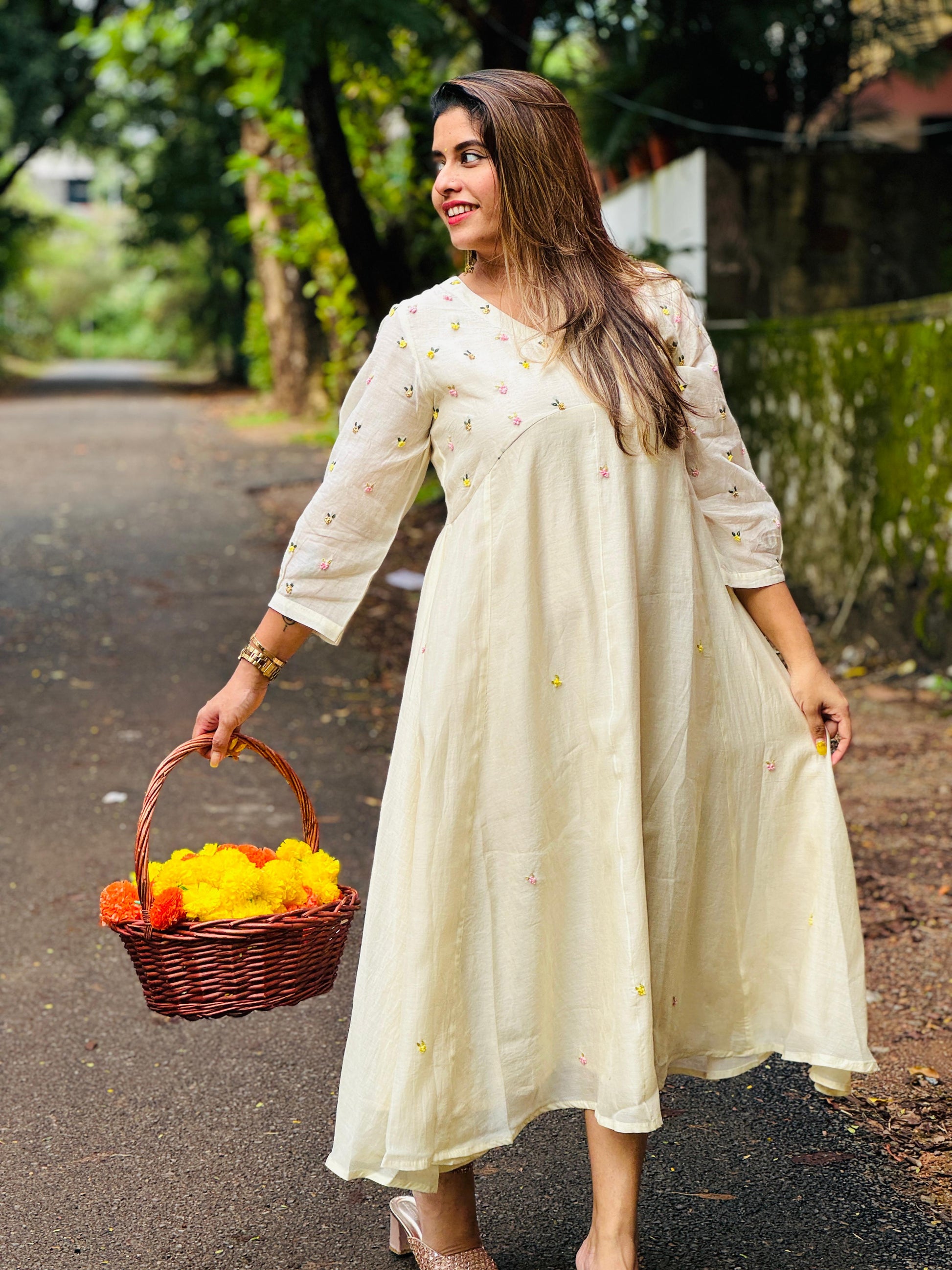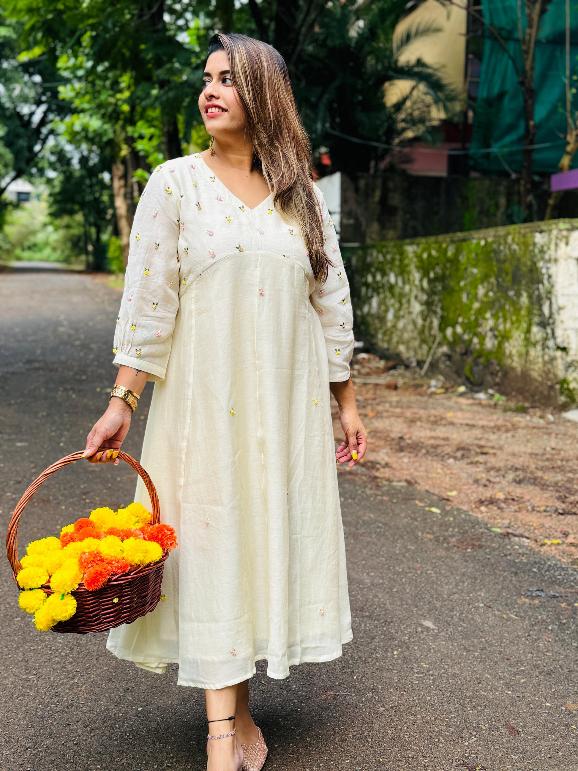 This is a very pretty off white a line dress comes with hand embroidered detailing all over the sleeves and front part of the dress . It’s an easy breezy classy dress apt for an am to pm loom
