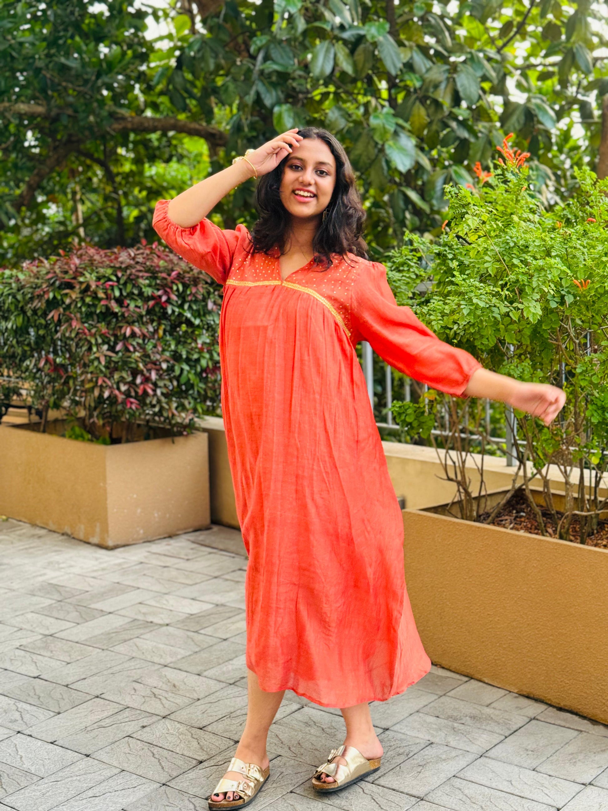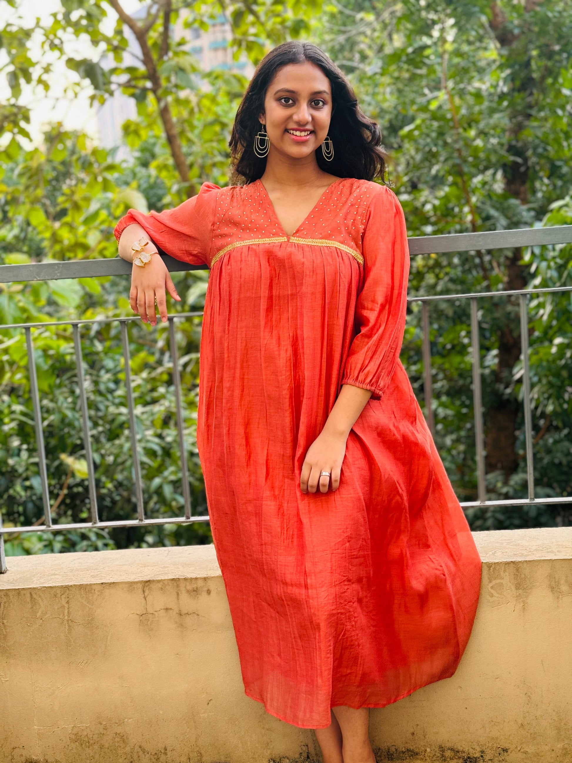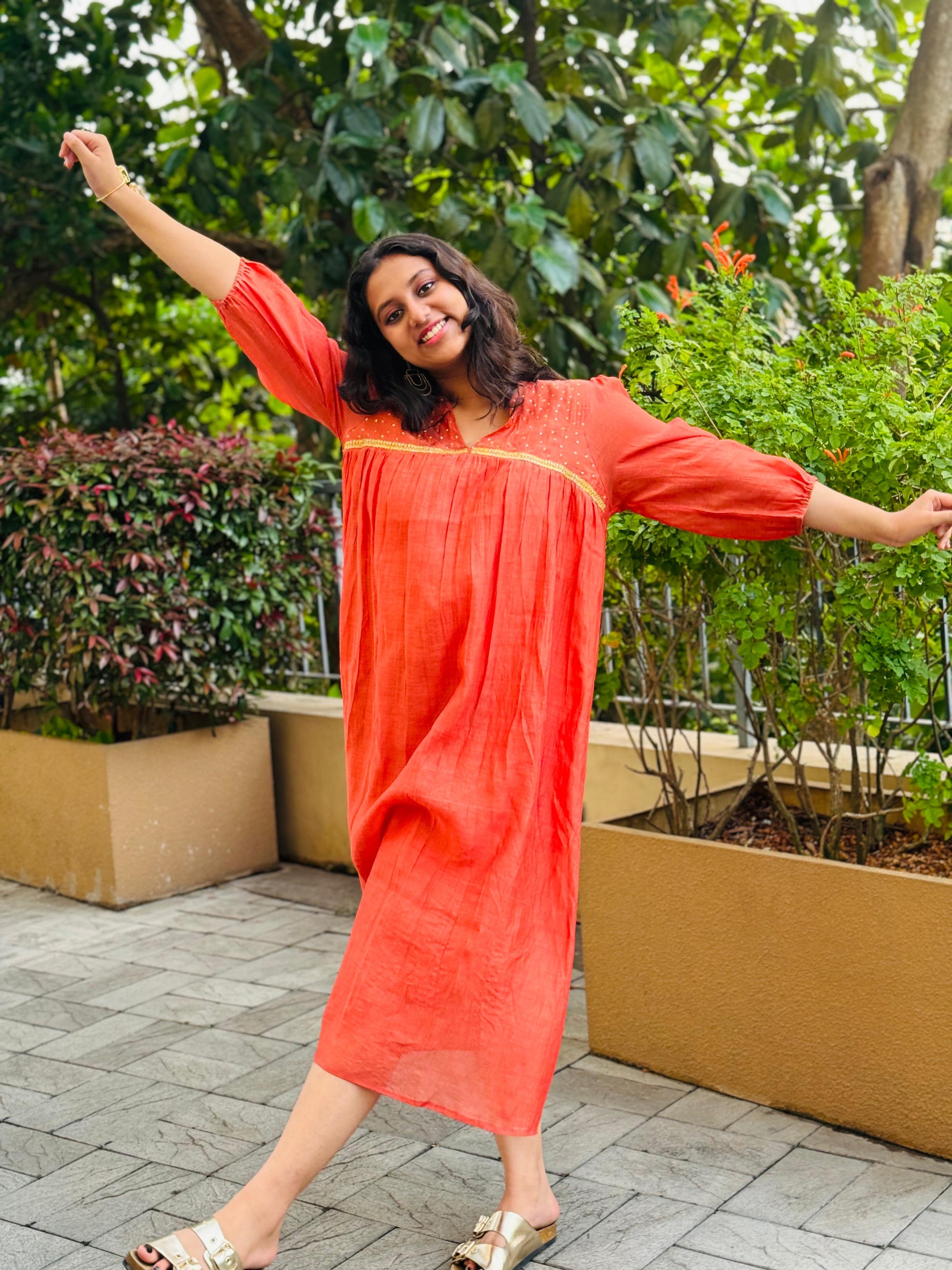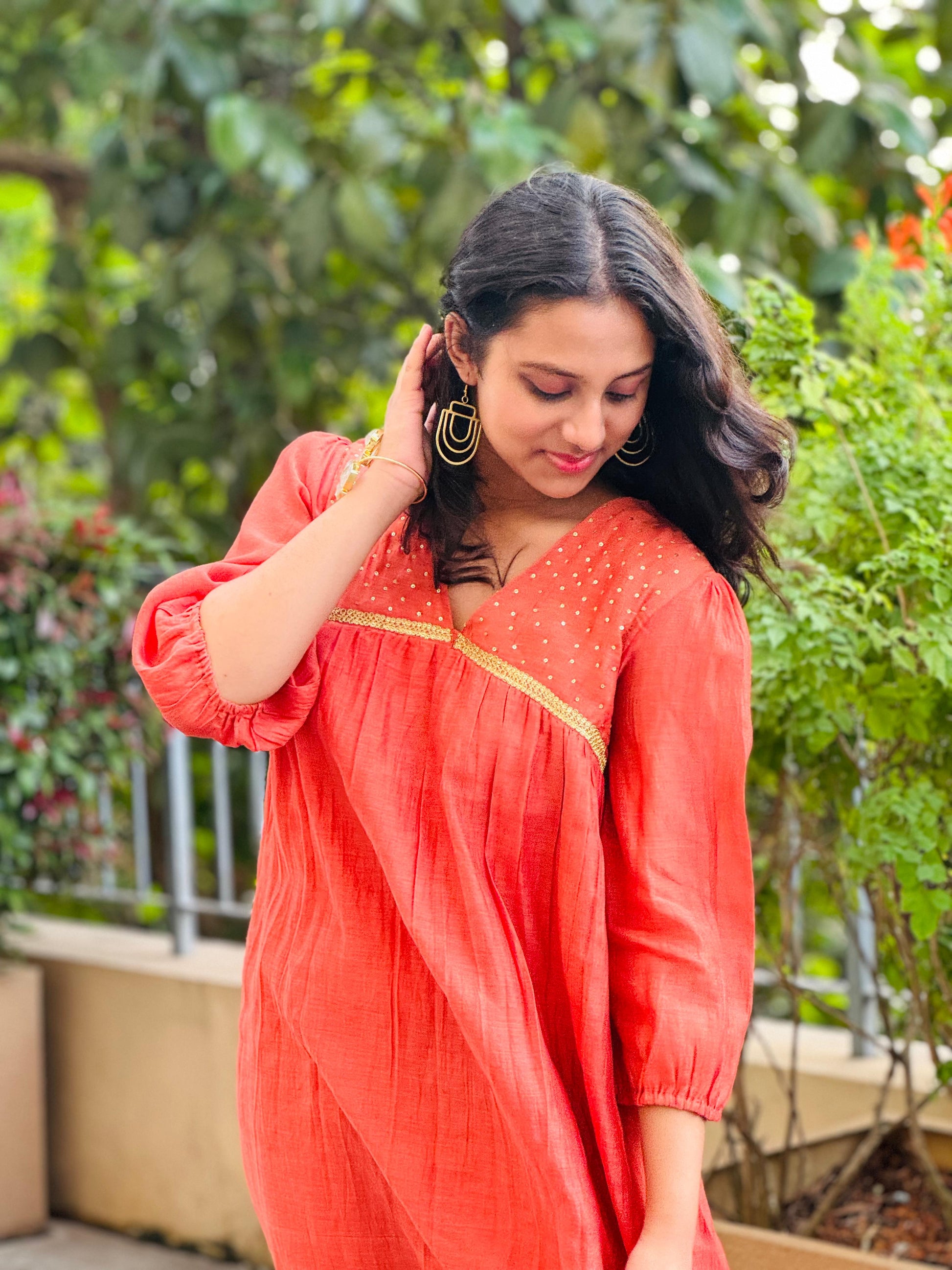 Stunning rust Orange tunic dress made with comfortable hand woven silk cotton fabric . Intricate hand embroidery on bust line . One can Wear it as a tunic dress or pair it with our same shade stright pant to give it a classy indo Western finish .