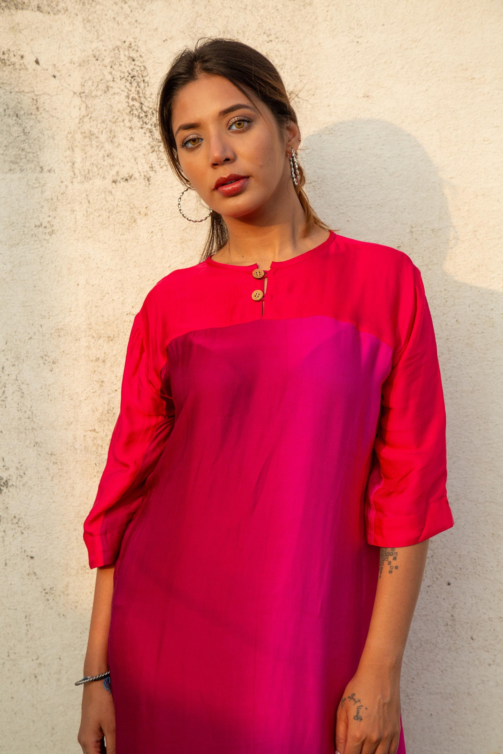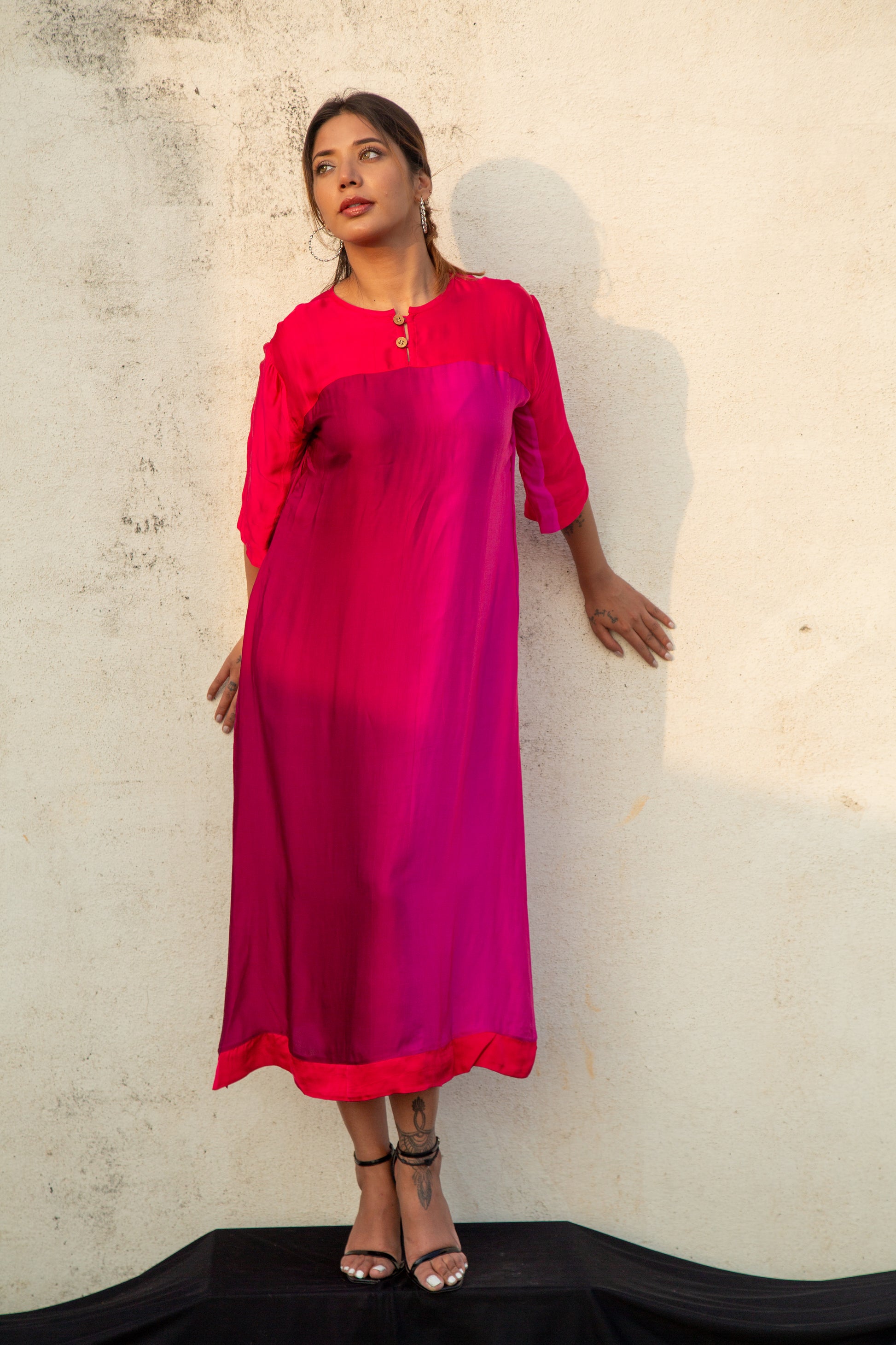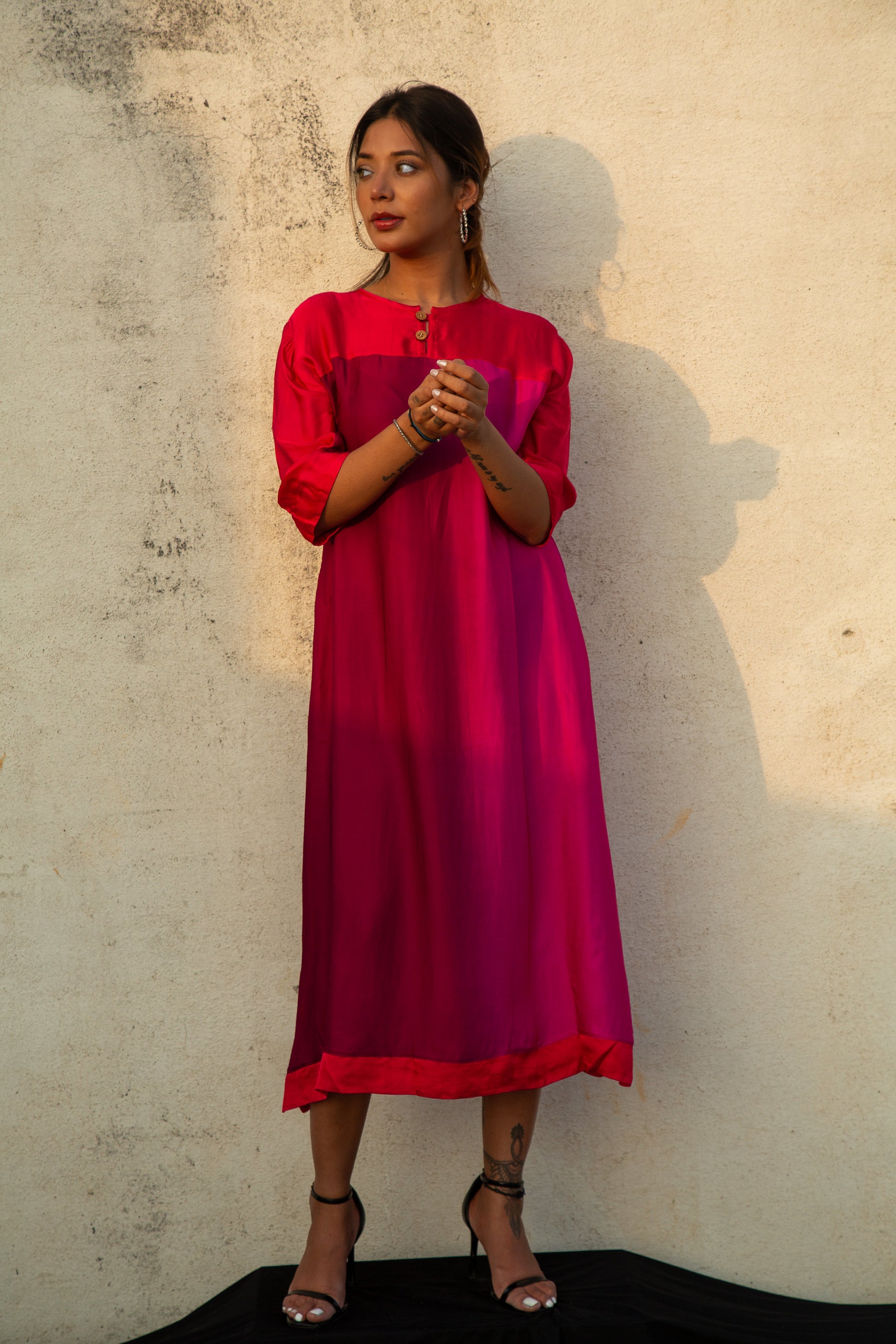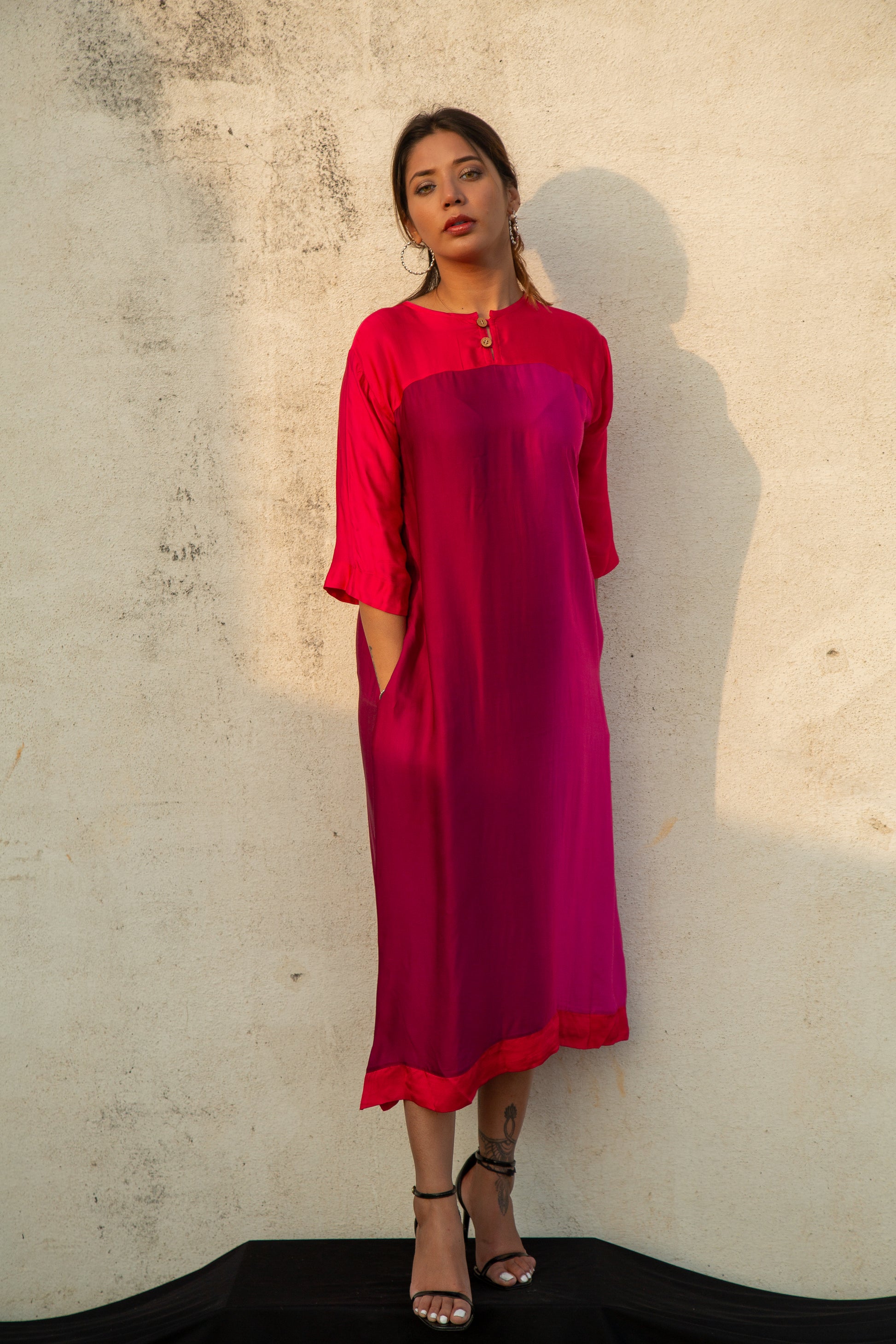 Make a bold statement with this two-toned modal silk dress in deep red and pink hues. Featuring two side pockets, it’s as practical as it is stylish.